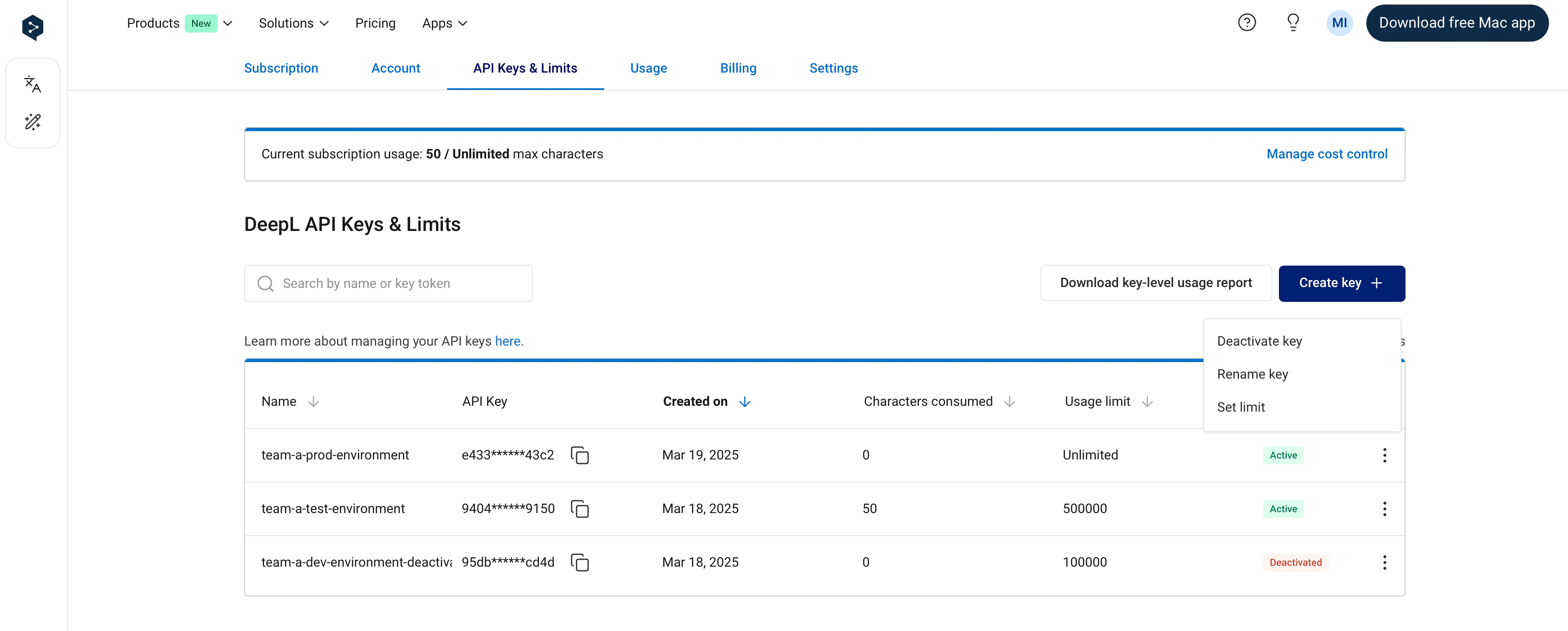 It’s possible to set an API key-level usage limit. Key-level limits restrict the number of total characters (across text translation, document translation, and text improvement) that can be consumed by an API key in a one-month usage period. You can see the dates of your current usage period in the Usage tab. For example, if you set a key-level usage limit of 1,000,000 characters, the API key will not consume more than 1,000,000 characters per usage period. In the “API Keys & Limits” tab, the “Characters consumed” column in the API keys table shows the number of characters consumed by an API key in the current usage period. The character count will “reset” at the start of the next usage period, at which point the key will again be able to consume characters. As with subscription-level cost control:- You’ll receive notification emails when 80% and 100% of a key-level limit has been reached